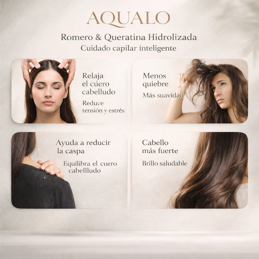 AQUALO Shampoo fortalece el cabello desde la raíz y estimula su crecimiento natural gracias a su fórmula con romero y queratina hidrolizada.